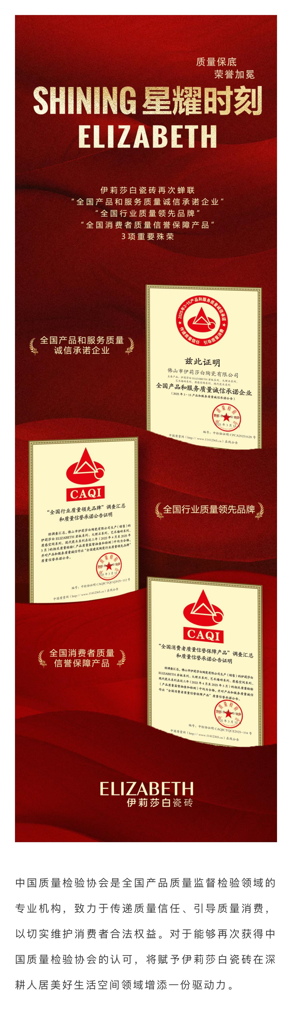 Shining星耀時(shí)刻 | 伊莉莎白瓷磚蟬聯(lián)中國質(zhì)量檢驗(yàn)協(xié)會(huì)3項(xiàng)重要殊榮